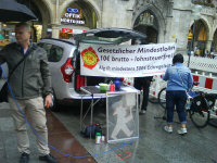 Aber nach Aufhängen des Transparentes verschwand der Regen, so dass wir zumindest noch ca. 30 Interessierte mit unseren Themen erreichten, wobei sich der "Mindestlohn-Schwindel" als roter Faden durch unsere Aktion zog. Auch in den kommenden Wochen bleibt dieses Thema auf der Tagesordnung und wir werden die Flugblätter dazu weiter verteilen.