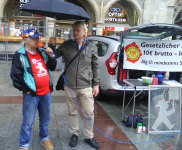 Am 26.5. konnte zur montäglichen Aktion erstmals auch das Transparent für 10 Euro lohnsteuerfreien gesetzlichen Mindestlohn und 500 Euro Eckregelsatz zum Einsatz kommen. Leider wurden wir zunächst eingeregnet und starteten die Montagsdemo bzw. den Aktionstag mit wenigen Teilnehmern bzw. Zuschauern.
