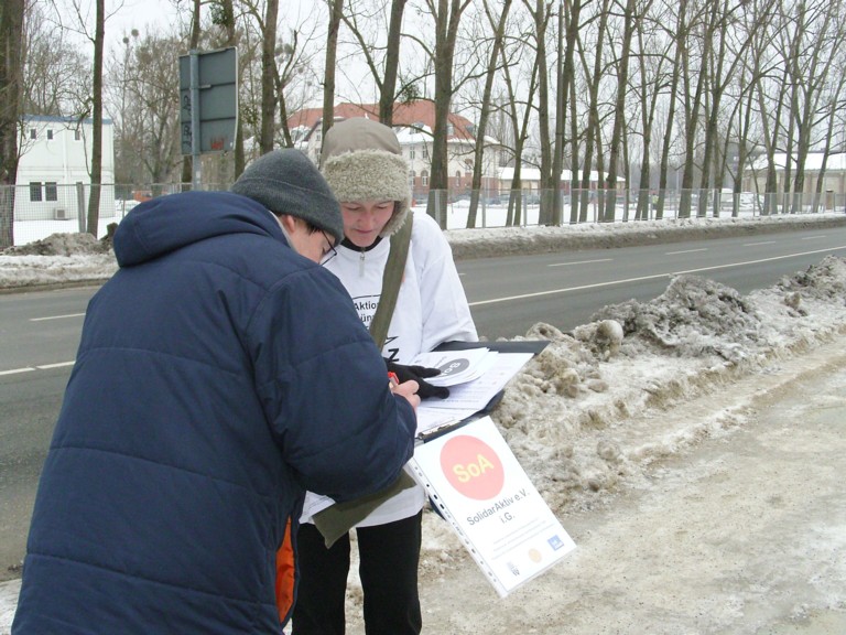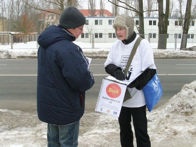 In Potsdam, vor der PAGA im Horstweg, wurde über das Urteil des Bundesverfassungsgerichts informiert, es wurden Flugblätter für 500 Euro Eckregelsatz (und 10 Euro Mindestlohn) verteilt und Unterschriften für diese Forderungen (www.500-euro-eckregelsatz.de) gesammelt.