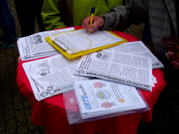 In diesem Jahr mussten sich leider Parteien/Organisationen einerseits und Gewerkschaften andererseits auf verschiedenen Seiten des Platzes gegenüber stehen. Der Stand des Offenen Runden Tisches Zeitz (ORTZ) stand also in der Nähe der großen Bühne. Deren lautstarkes Programm erschwerte also die Kommunikation an den Ständen. Dennoch konnten etliche Unterschriften gesammelt und Infomaterial verteilt werden.