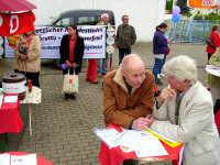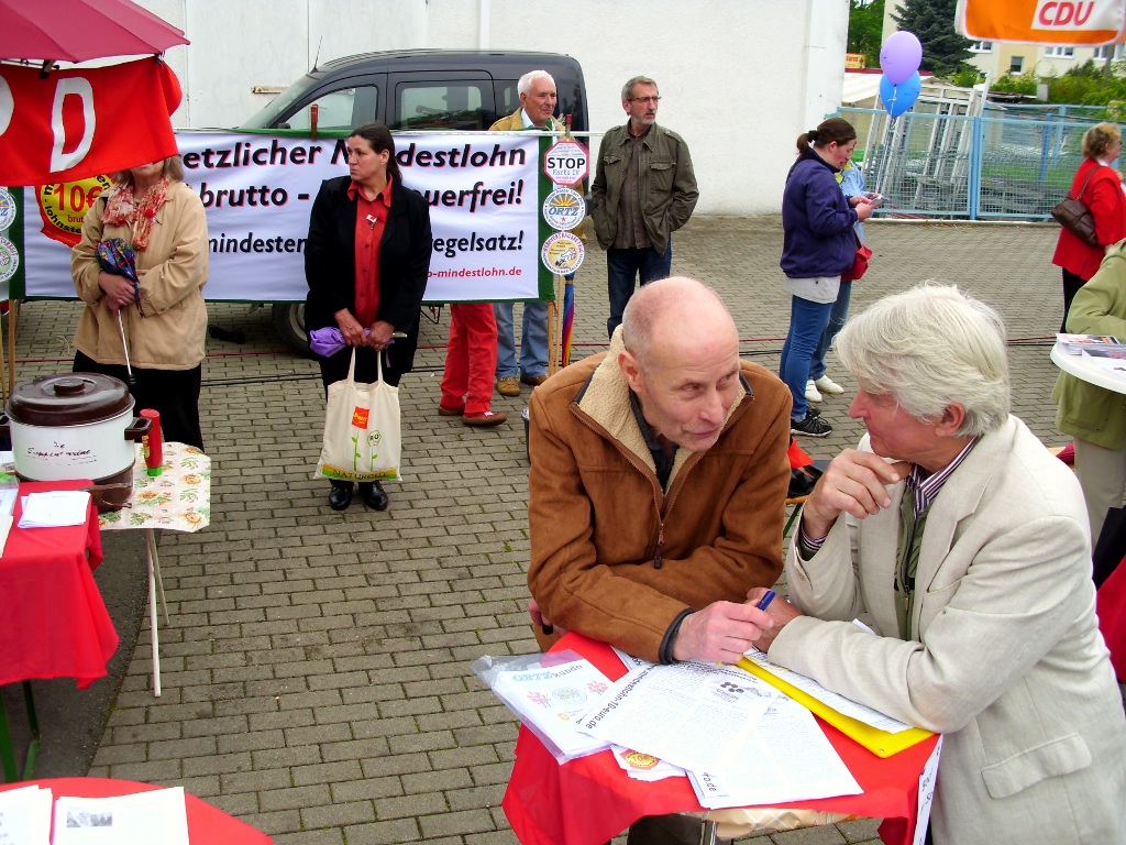 In diesem Jahr mussten sich leider Parteien/Organisationen einerseits und Gewerkschaften andererseits auf verschiedenen Seiten des Platzes gegenüber stehen. Der Stand des Offenen Runden Tisches Zeitz (ORTZ) stand also in der Nähe der großen Bühne. Deren lautstarkes Programm erschwerte also die Kommunikation an den Ständen. Dennoch konnten etliche Unterschriften gesammelt und Infomaterial verteilt werden.