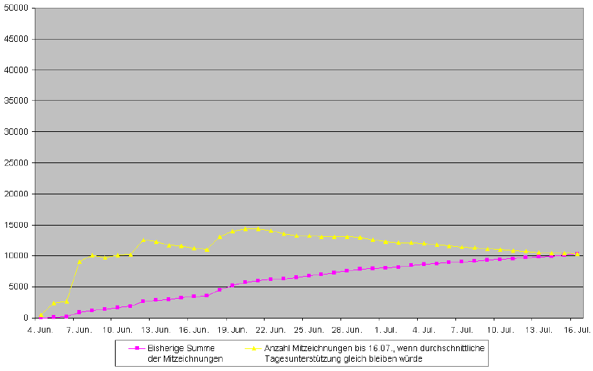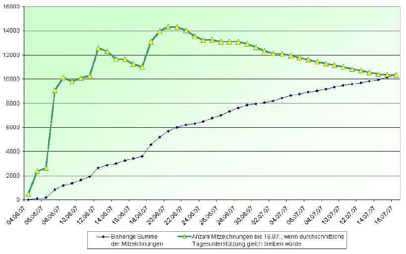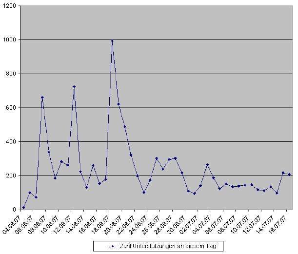 Diese wurde am 18. Juni 2007 an unseren bundesweiten Verteiler versendet, worauf die Unterstützung der Petition bundesweit stark zunahm. Innerhalb von 12 Stunden wurden mehr als 1.000 Mitzeichner dazu gewonnen. Um diesen Trend beizubehalten, liegt noch eine Menge gemeinsame Arbeit aller an einem Erfolg der Petition Interessierten bis zum 16. Juli vor uns!