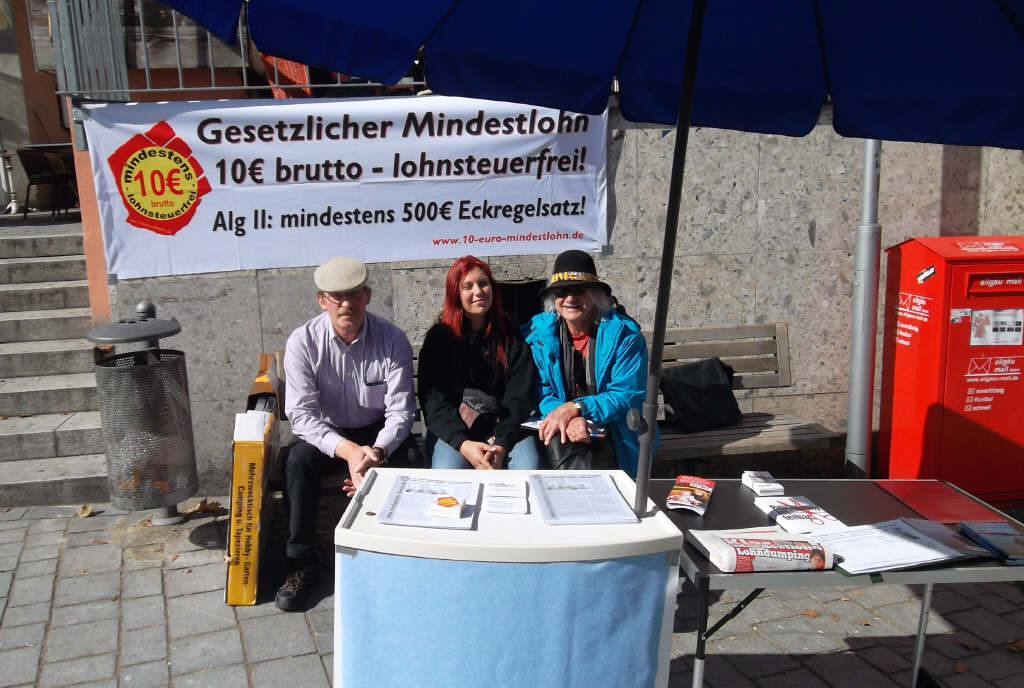 --> Bericht:Am 2. Oktober 2012 konnten wir einen von Erfolg gekrönten Infostand in Kempten/ Allgäu durchführen. Einen weiteren Infostand werden wir auf Anfrage eines Mitstreiters in Kaufbeuren durchführen (Wetter ist entscheidend). Vierzig Unterschriften konnten auch gesammelt werden, entscheidend aber war, der große Zuspruch und das Interesse an der