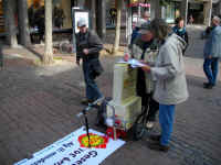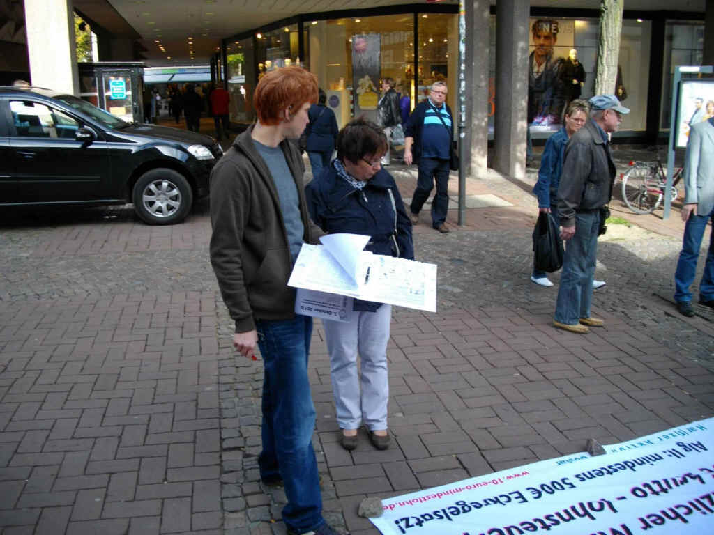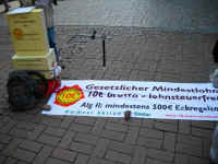 Auch gute Diskussionen mit den Passanten haben währenddessen stattgefunden. Vor allem die von der Kampagne geforderte und begründete Lohnsteuerfreiheit des gesetzlichen Mindestlohns (das bedeutet die Anhebung des jährlichen steuerlichen Grundfreibetrages von 8.000 auf 20.000 Euro) hat viele Leute überzeugen können. Auch Kleinselbständige profitieren davon und unterstützen unter diesen Umständen auch den gesetzlichen Mindestlohn, für den sie sonst ja meist nicht zu gewinnen sind.