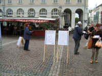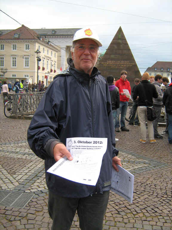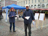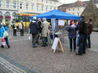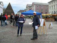 Am Donnerstag nachmittag haben sich trotz kühlem und regnerischem Wetter auf dem Karlsruher Marktplatz zahlreiche Bürgerinnen und Bürger an unserem Info-Tisch eingefunden, um über die Zusammenhänge von Mindestlohn und staatlich gewährtem Existenzminimum, sowie über die zunehmende Jugendarbeitslosigkeit und Altersarmut in Deutschland und der Eurozone zu diskutieren.